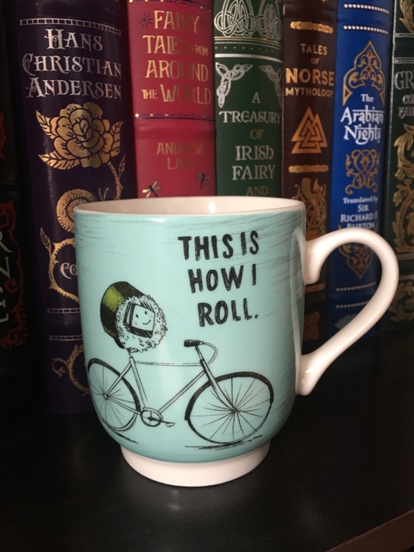 Today’s session seemed a little more aggressive as far as manual therapy was concerned. It was painful, but I had less stiffness afterward. I’m getting bruised up from the “massages”, but they’re so beneficial. I think the therapist was trying to make sure I left in the best possible shape I could today since I’ll be away from therapy for four weeks. I wrote before that my insurance company is stingy with its rehab benefits, so we’re making use of most of them once the boot is gone. I can do a lot of the stretching and range of motion exercises at home, so it makes sense to do it that way. He told me not to hesitate to call or stop in if something didn’t feel right or if I had questions in the meantime, so at least I’ll still have some support if I need it. He told me again this morning not to overdo things. I still think he doesn’t quite trust me π My session this morning overlapped with my neighbor’s session, so we were chatting, and I think my therapist was a little taken aback when I said I rode 20-30 miles a day, or about 130 miles a week last year. I guess that number sounds high to people who aren’t bike people, but most days I just rode an hour and a half to two hours and however far I got was however far I got. I usually get in the zone when I’m riding and don’t even notice time pass. I just ride until I can’t go any farther. I’ll let my amazing new tea mug sum things up for me below: