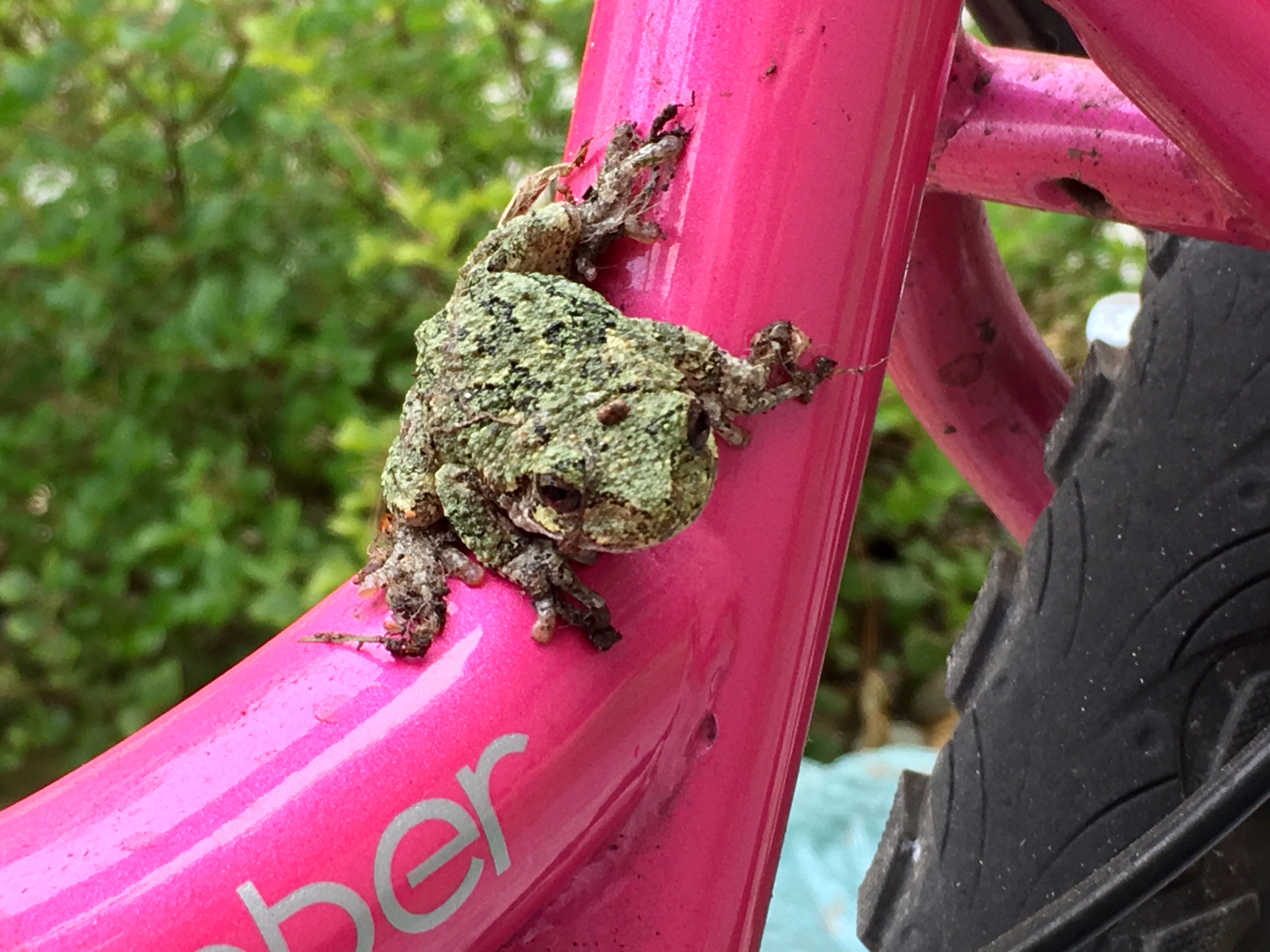 Other than trying my hardest at therapy, I’ve been trying to get out biking. I’ve found that about once a week I can do an hour long ride, but the other days are shorter. When my physical therapist asks me every week how much I’ve been out, I usually tell him, “Not as much as I want”. He laughs at me for always saying that, but it’s true. Compared to last year, I’m doing about half so far. A couple of weeks I’ve gotten as high as 70 miles, but most weeks hover at 45-50 miles. I know one day I’ll get there again. I did make a new friend while riding: a cute little frog that didn’t want to leave my bike.